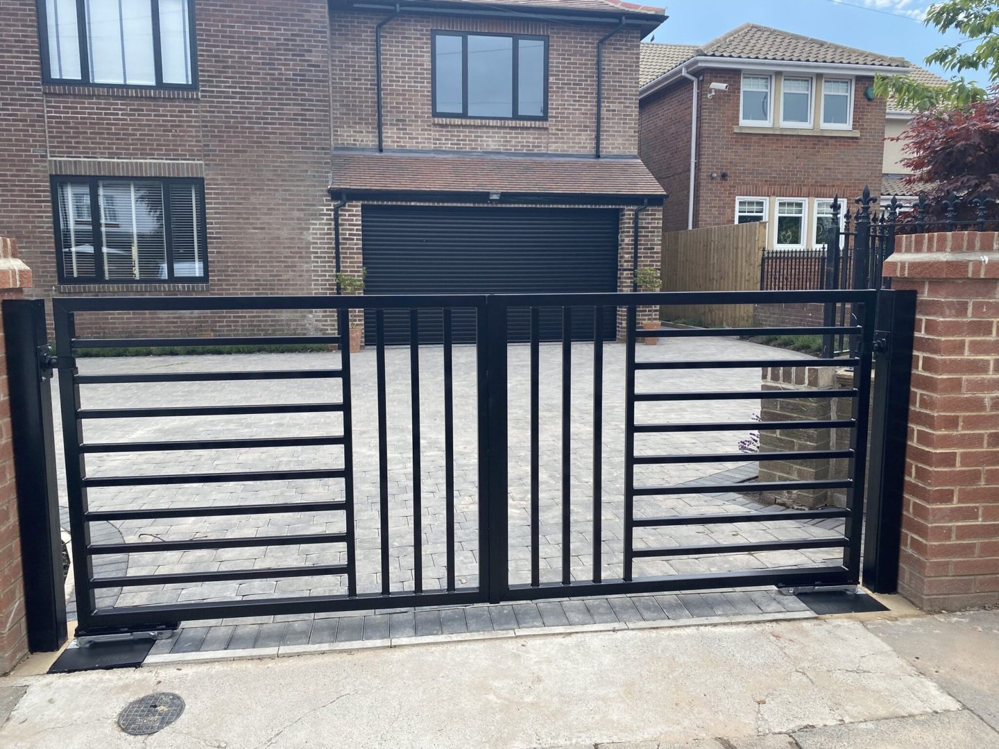 Contemporary Automated wing gates with pedestrian gate to match Home > Projects > Domestic > Contemporary Automated wing gates with pedestrian gate to match July '20 By Riverside Metalwork Contemporary, galvanised and power coated automated wing gates with matching pedestrian gate.